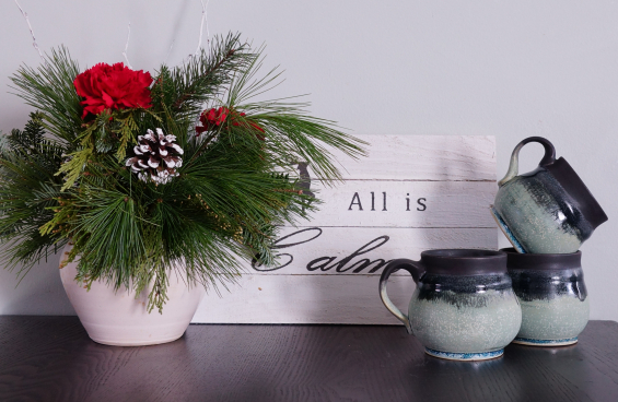This set of mugs was part of my Christmas Series! They were thrown and altered on the wheel. The speckles on the bellies of these pieces come from the pale seaweed glaze that is paired with the soft black glaze along the lip and interior. They can hold 12 ounces.